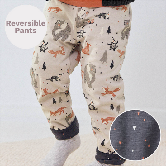 Woodland Animals | Beige - Anthracite | Kids Reversible Pants | GOTS Organic Cotton