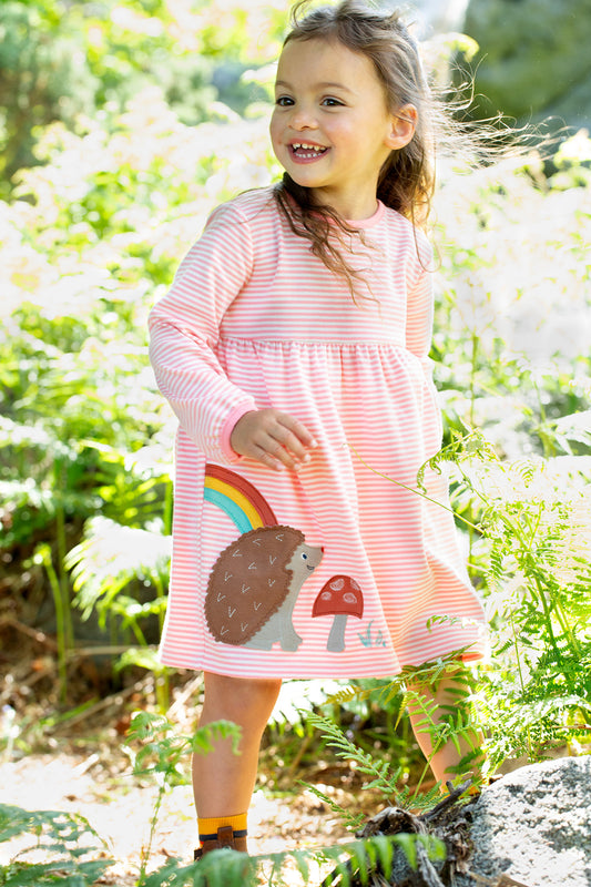 Guava Pink Stripe - Hedgehog | Dea Dress | Long Sleeve Dress | GOTS Organic Cotton