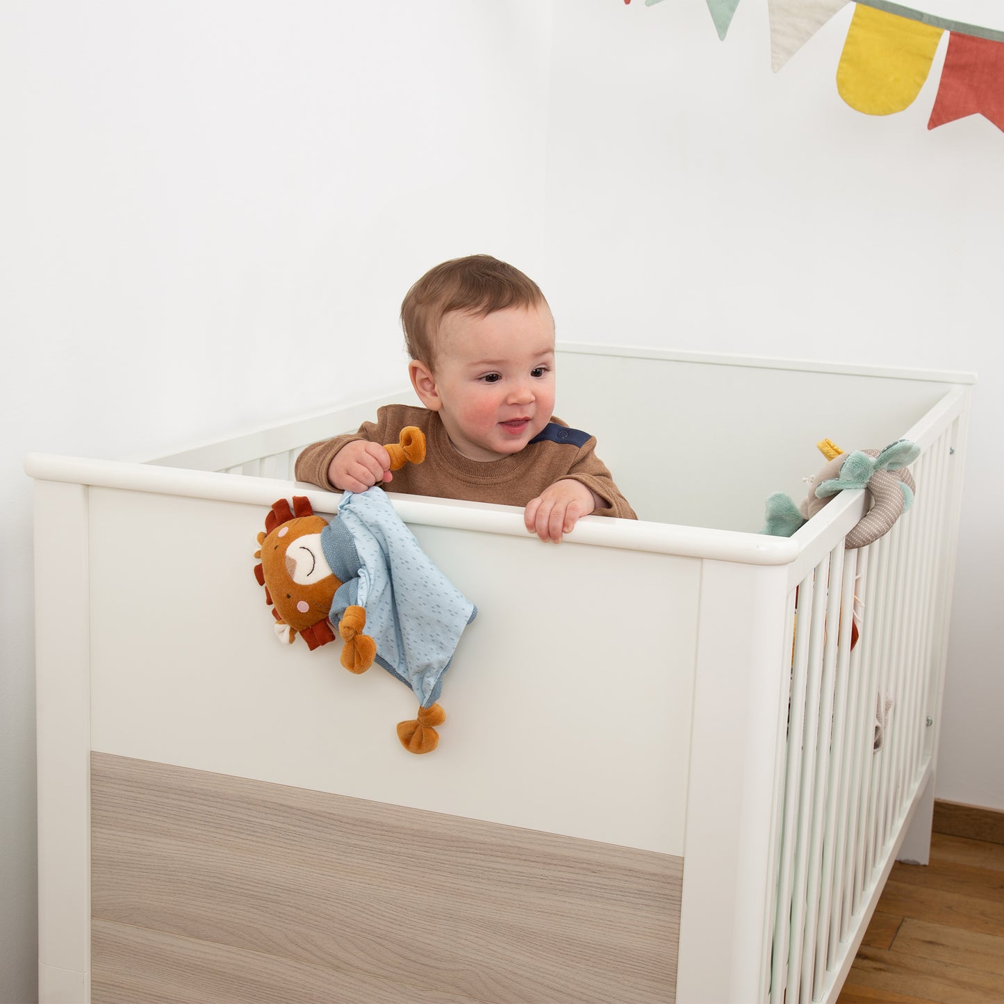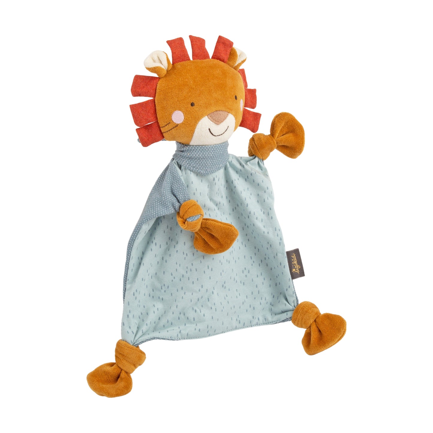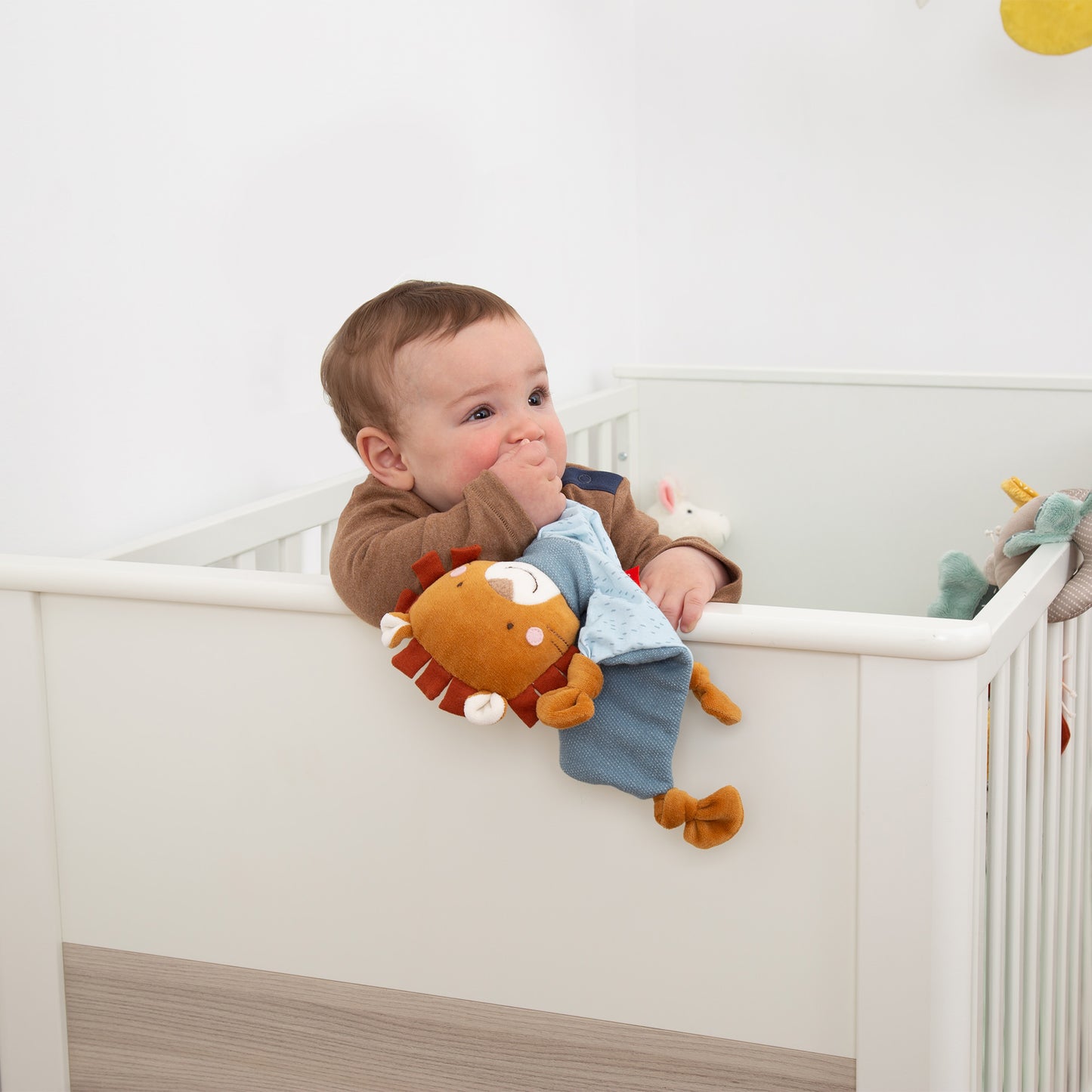 This adorable lion comforter is ready to be your baby’s snuggly best friend from day one. Made from a mix of velour, jersey, and jacquard fabrics, it offers a variety of textures that are perfect for little hands to touch, cuddle, and chew. The sweet embroidered face adds an extra touch of charm, while the four knotted corners provide plenty to grasp and explore. A handy hanging loop on the back makes it easy to attach to prams or cots, so comfort is always within reach.