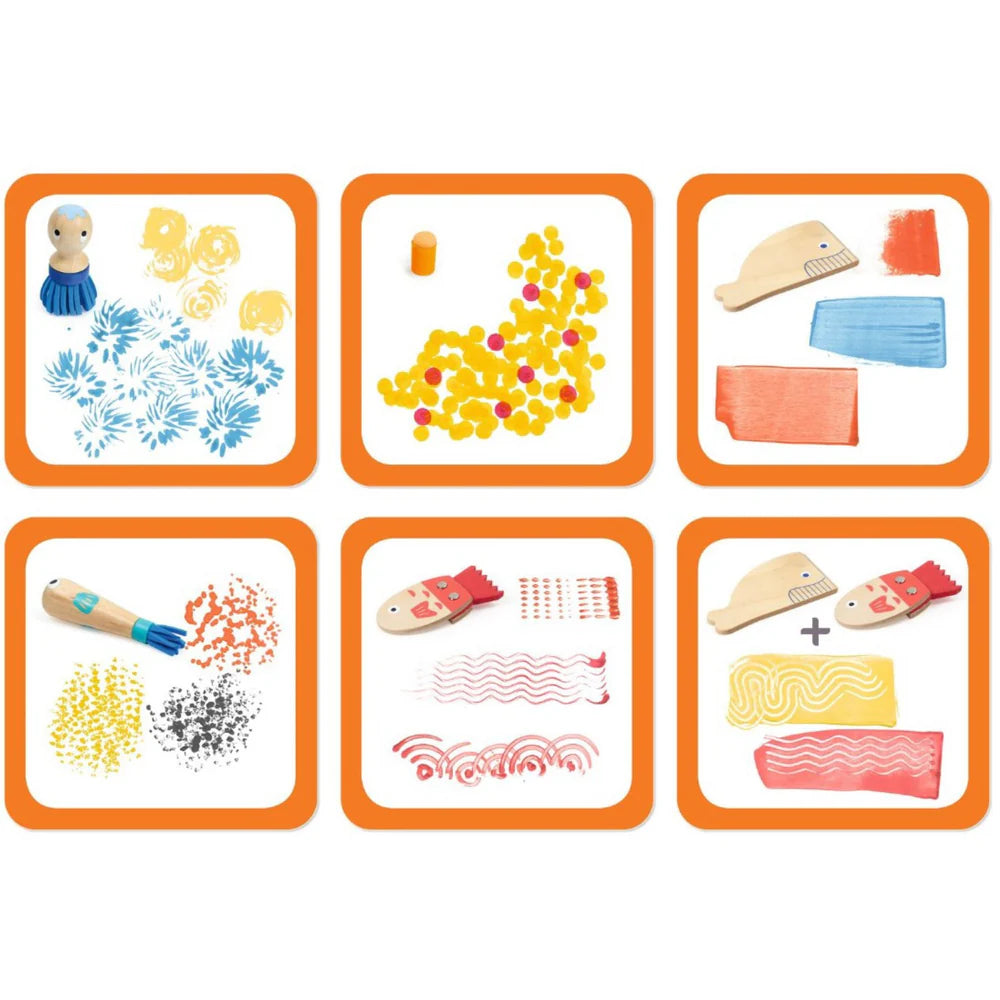 ►Art & Craft Kit Includes: 6 wooden (FSC® certified) painting tools and 6 sponges. 10 instruction cards.