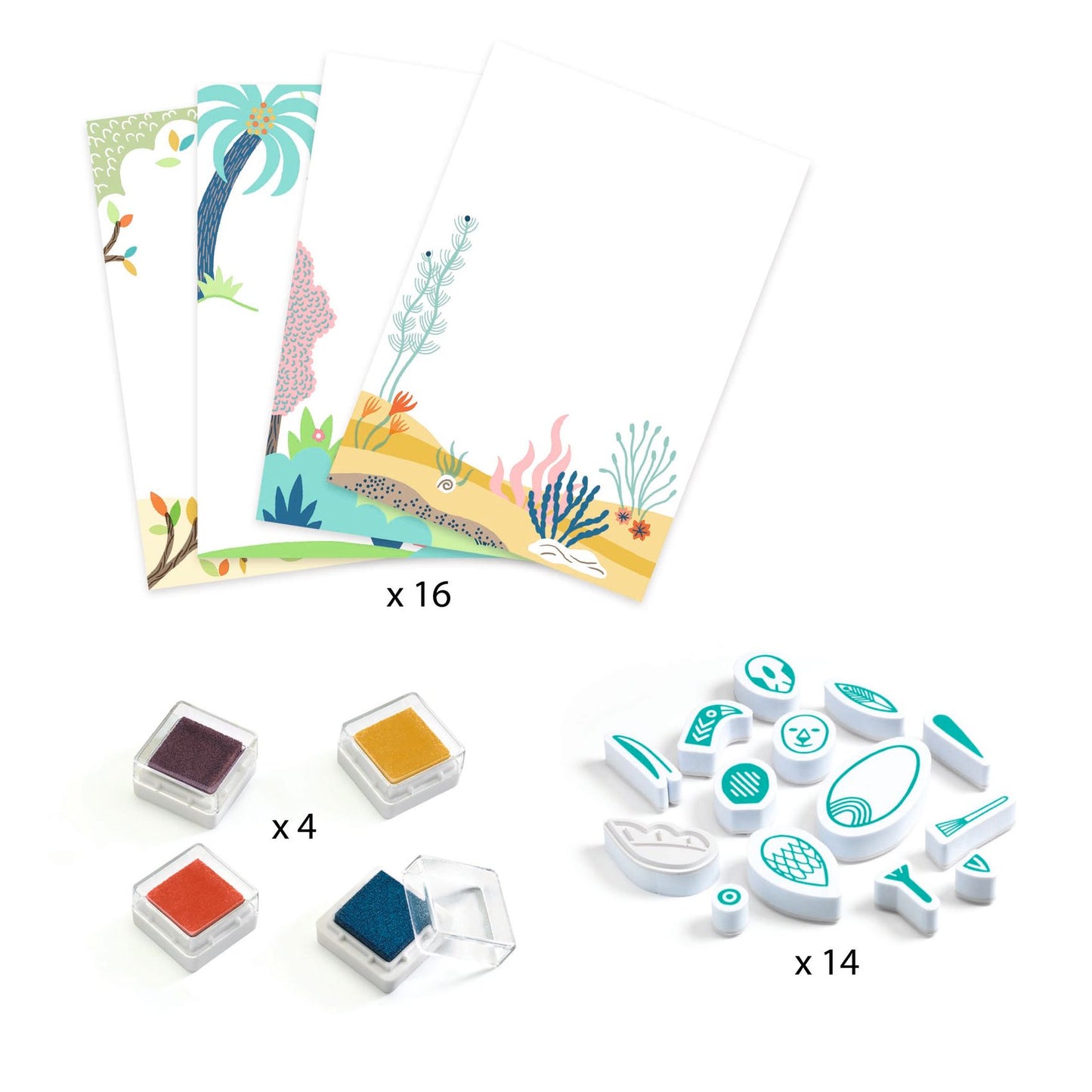 ►Stamp Set Includes: 16 scene cards (15.0 x 21.0 cm), 14 mix-and-match stamps, 4 ink pads in navy blue, yellow, vermilion, and taupe, plus a full-colour instruction booklet