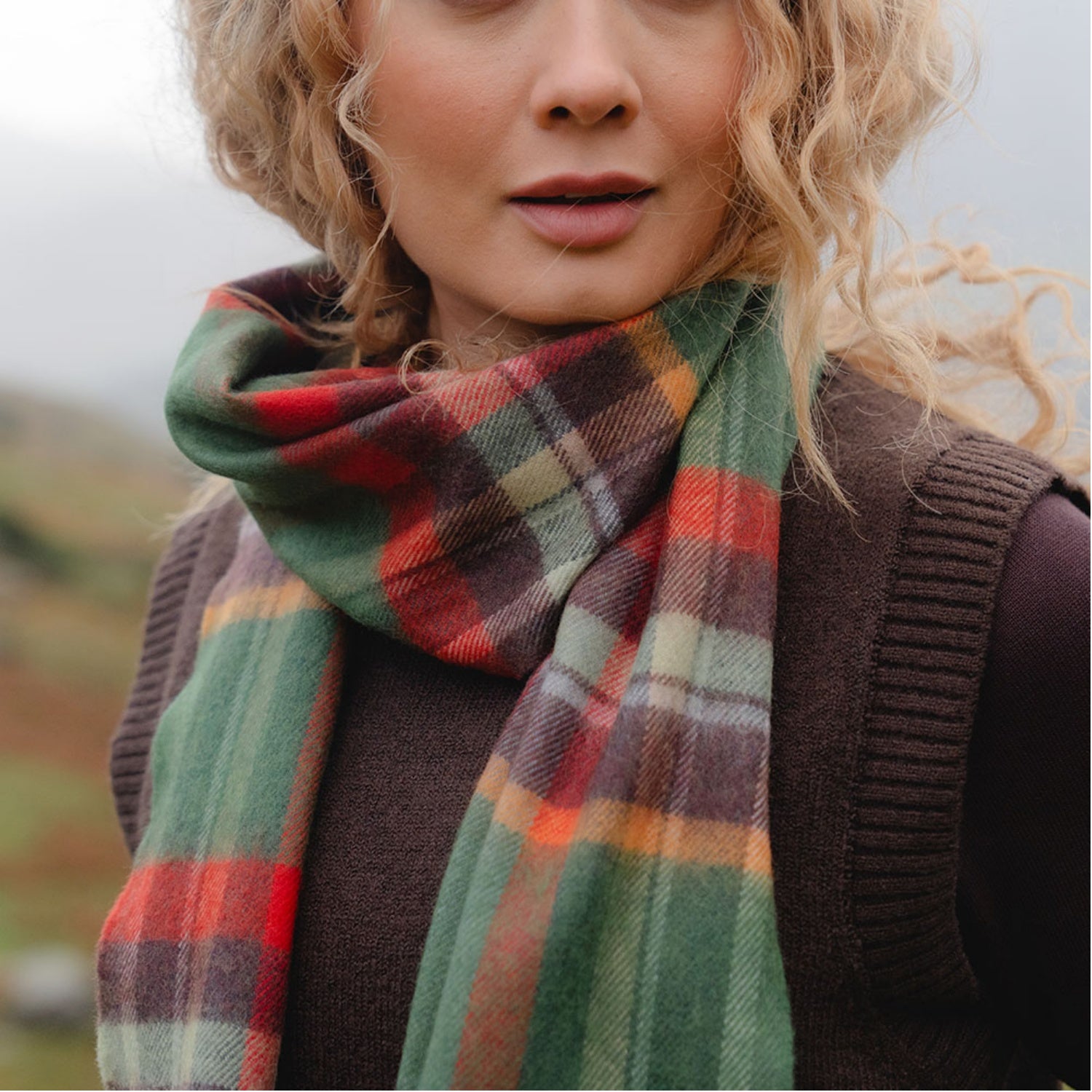 Green, Rust, Orange and Brown Check Pattern | Merino Luxury Wool Scarf | Made in Nenagh, Co. Tipperary