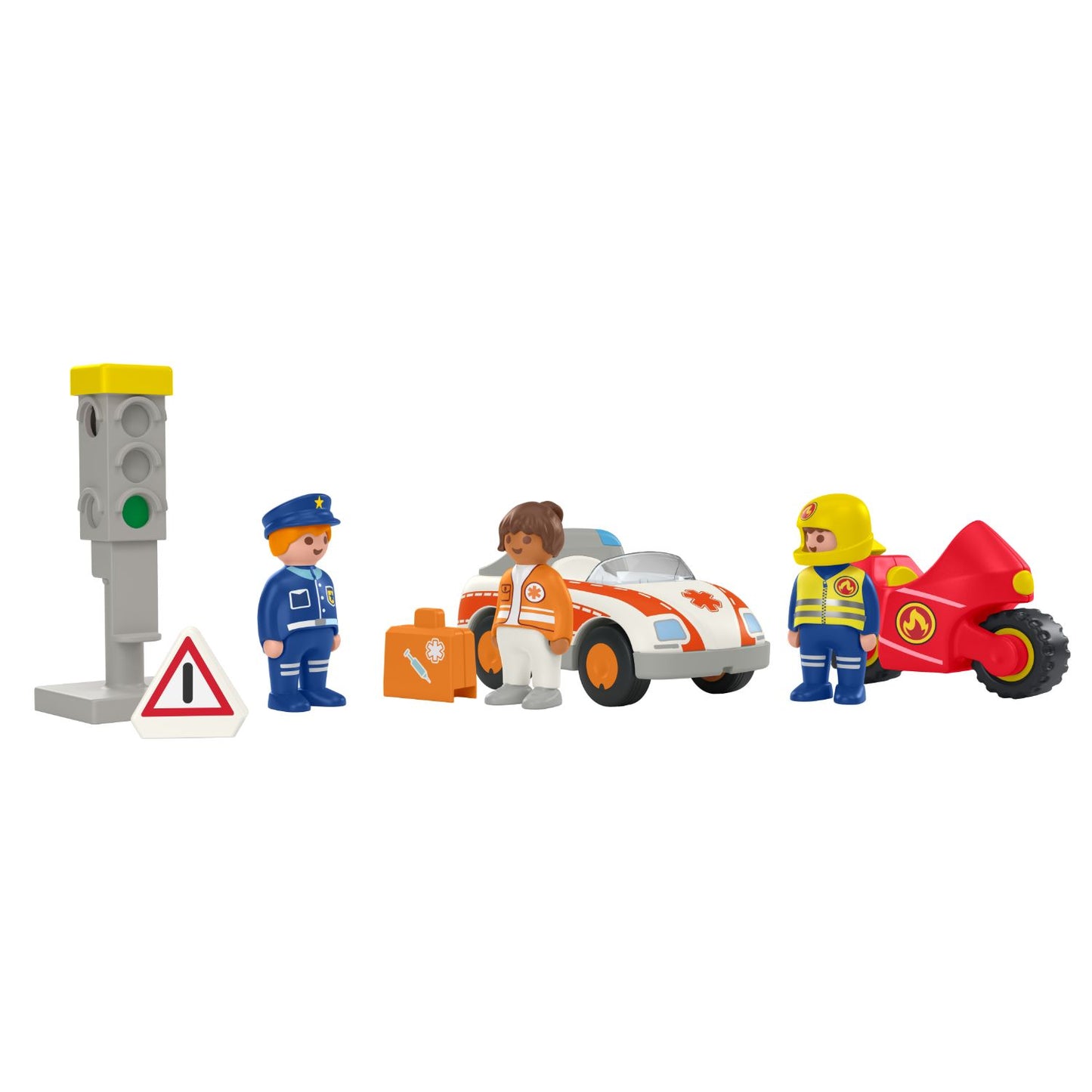 ►What’s in the box: Figures: 1 woman doctor, 1 firefighter, 1 policeman; Accessories: 1 emergency medical car, 1 firefighter motor bike, 1 traffic light, 1 emergency medial kit, 1 warning triangle; All made from more than 90% plant-based plastics. These plastics are as robust and easy to care for as usual. All packaging is made from at least 90% recycled cardboard and 100% recycled paper