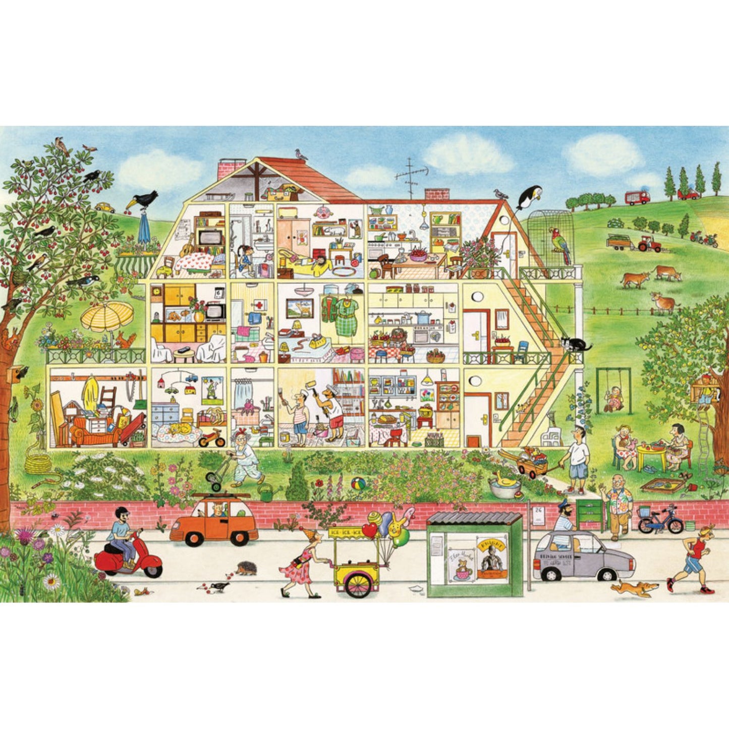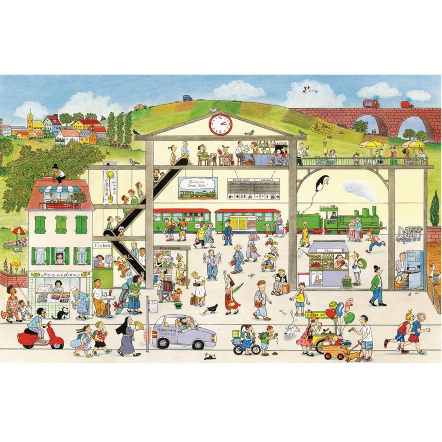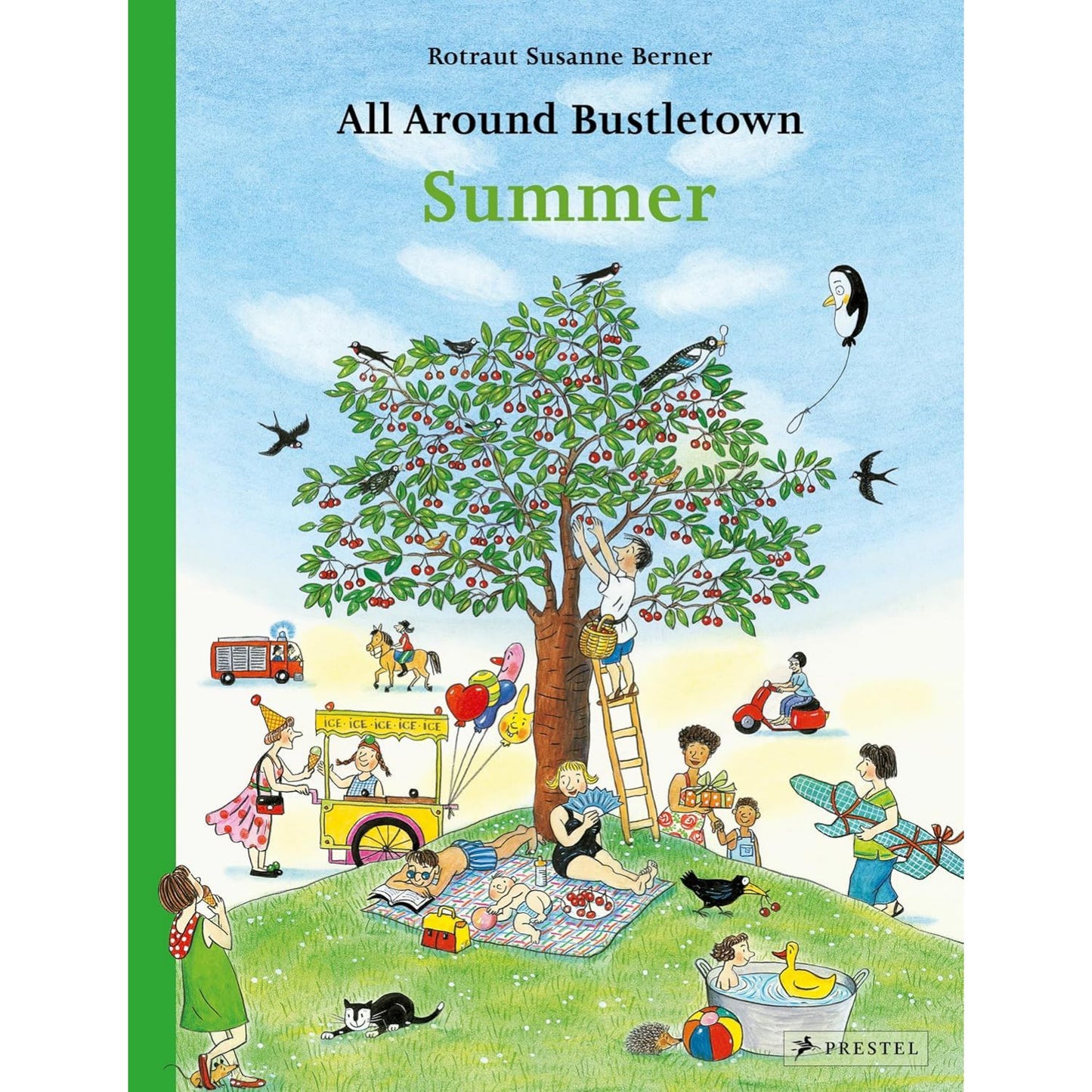 It's summer and that means flowers, picnics, thunderstorms, and bike rides. It's a busy time for construction workers, farmers, and house painters. Playgrounds are filled with kids and vacationers are boarding trains in droves. In the sky a pair of balloons drifts through every scene, while on the street people of all ages make their way to an outdoor birthday party. There's even a big storm that turns umbrellas inside out, sends hats flying, but ends in a lovely rainbow. As kids pore over these oversized spreads, they will delight in identifying the same characters on each page as they walk, play, jog, and roller skate - from homes to parks and office buildings to rail stations. In the tradition of Richard Scarry and Where's Wally, this book encourages kids to return again and again to these charming spreads, following along with the characters and inventing their own stories. All kinds of summer activities come alive in these endearing drawings that provide endless entertainment and spark engaging conversations.