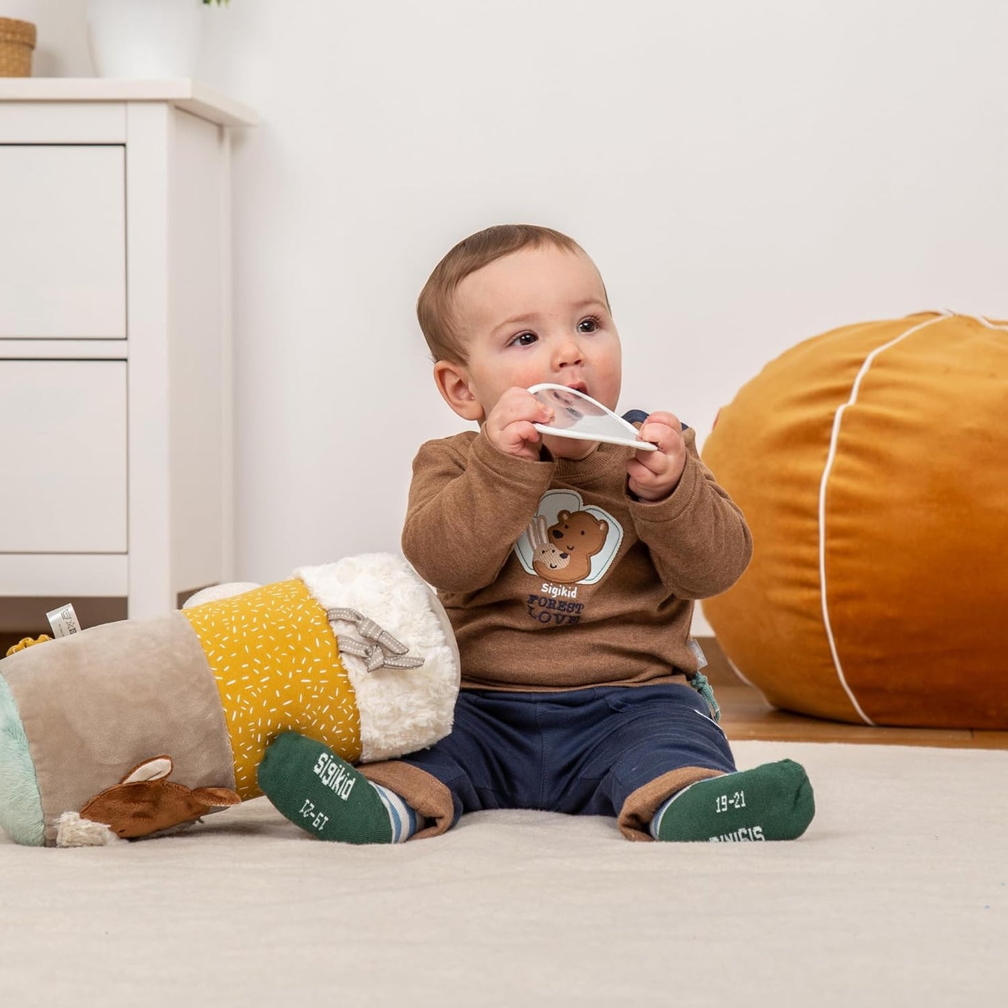 This adorable Fox Tummy Time Activity Roller from Sigikid is packed with fun features to help your baby explore and develop their senses. The gentle rattle inside and the subtle rustling sounds stimulate hearing, while the soft plush and smooth fabric textures invite tiny fingers to touch and discover. For those teething days, the fabric ring and knots offer a soothing option for little gums.