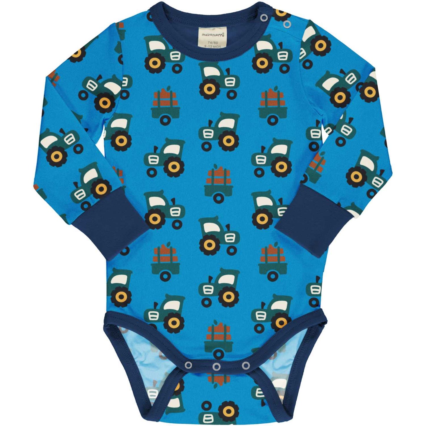Maxomorra Tractor Long Sleeve Body is a super soft organic cotton bodysuit for babies and toddlers with a gorgeous bold tractor print and contrasting trim and with poppers at the shoulder and between the legs that make getting dressed or nappy changing easy.