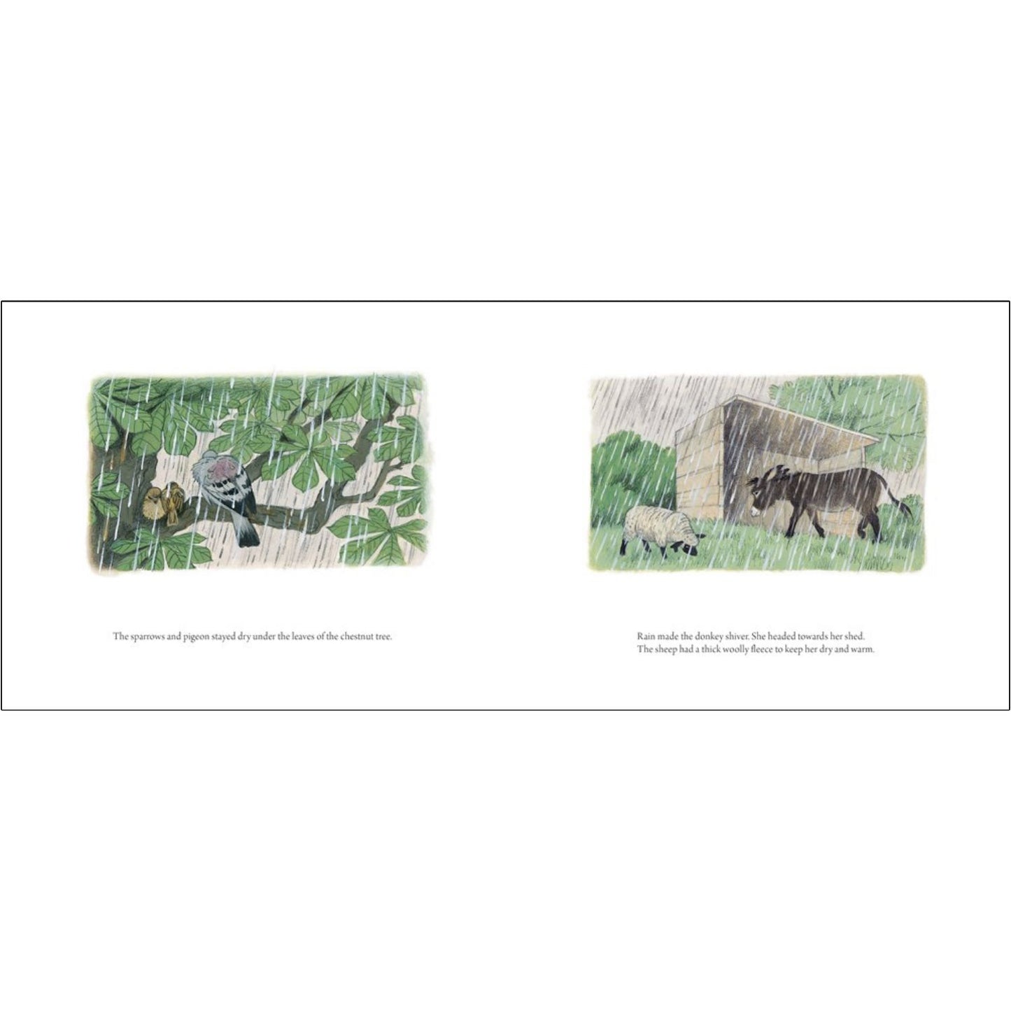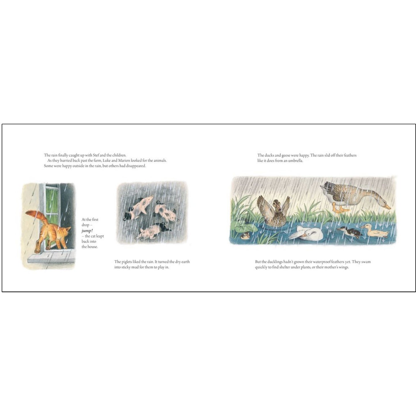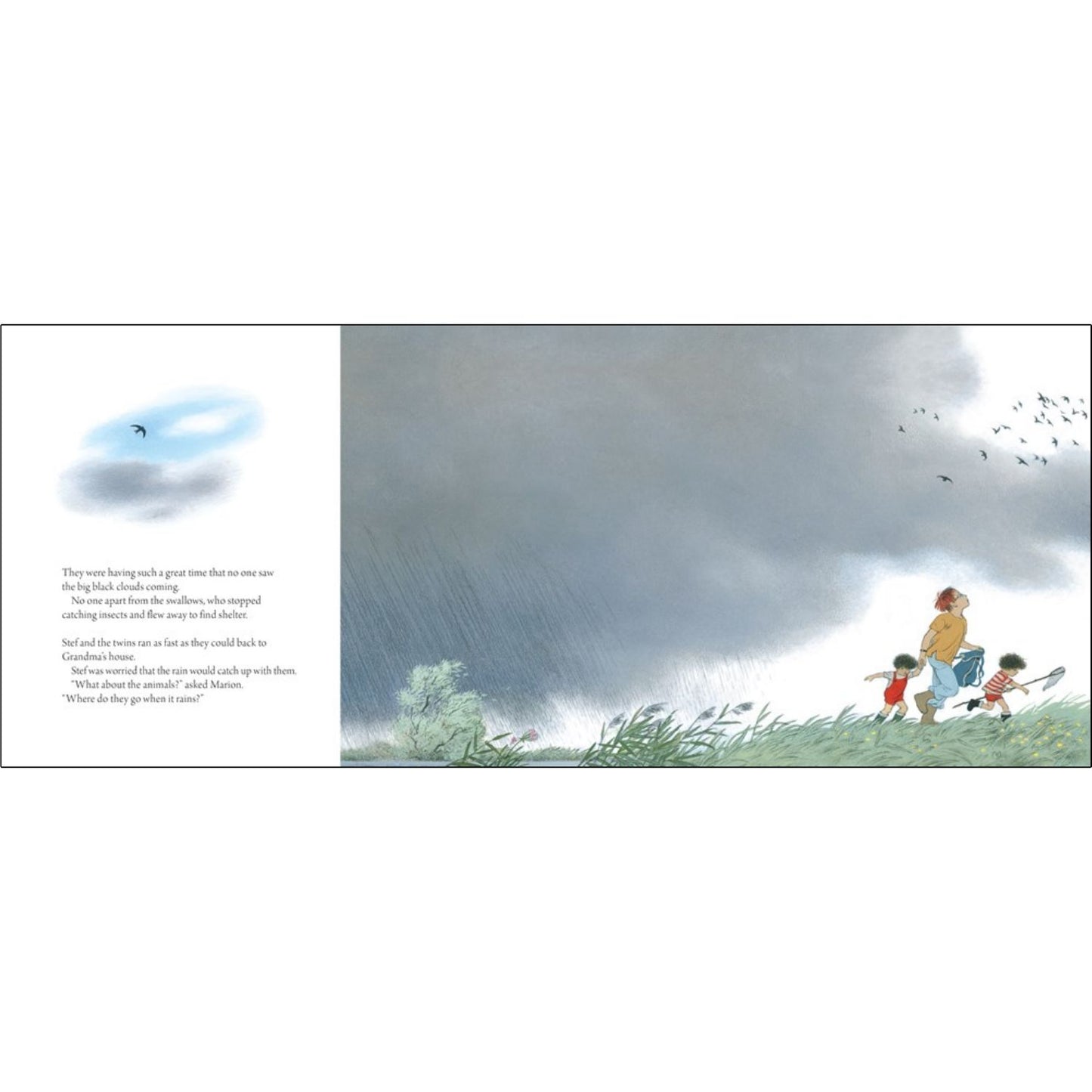 Stef takes the twins out for a walk to the pond. On their way they pass through fields full of flowers, grasshoppers and bees. They stop at a farm, where they feed the hens, pigs and ponies. But when they reach the pond, the clouds turn grey and it starts to rain. The twins love splashing about in the rain. But where do all the animals go when it rains?