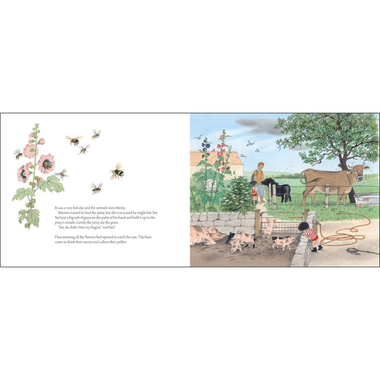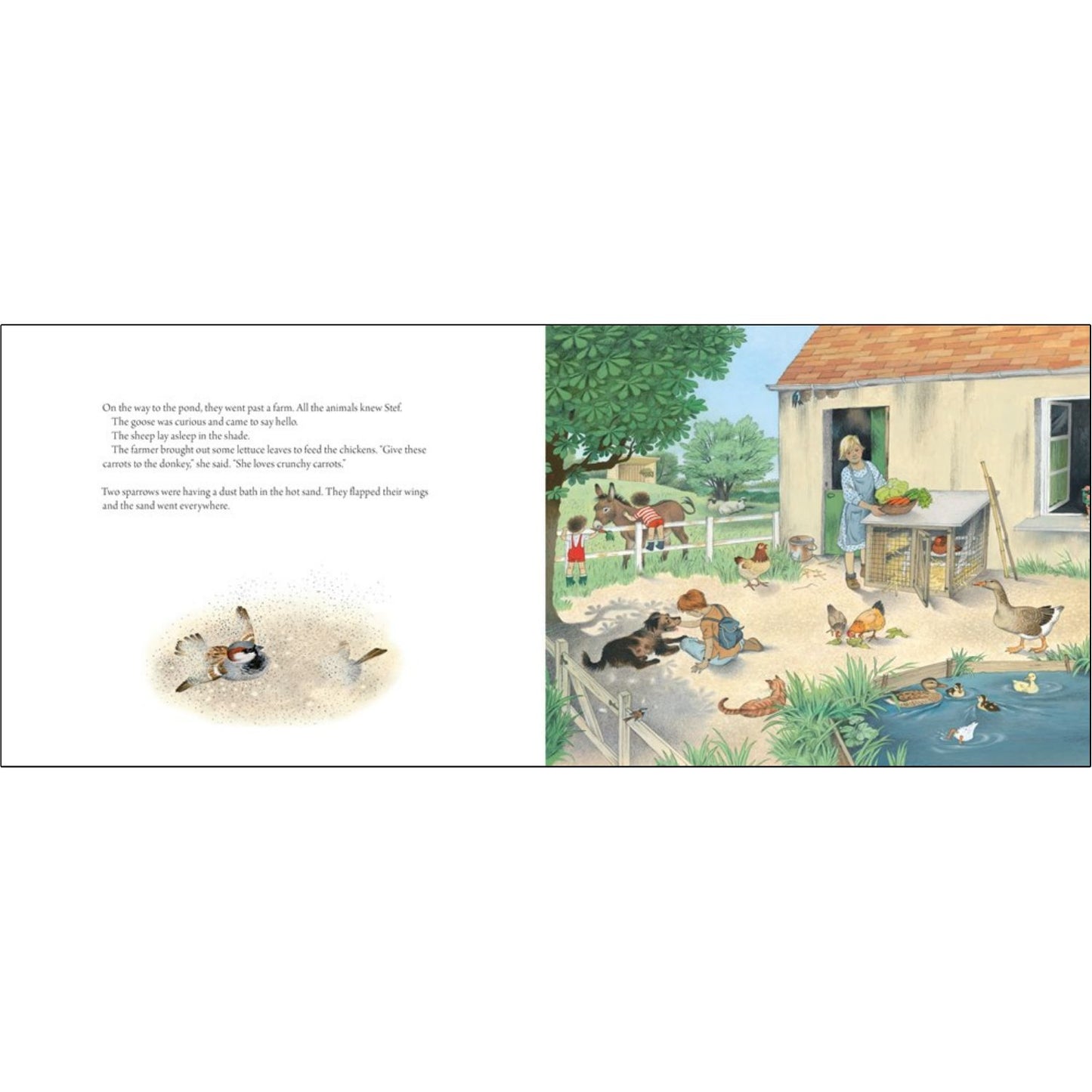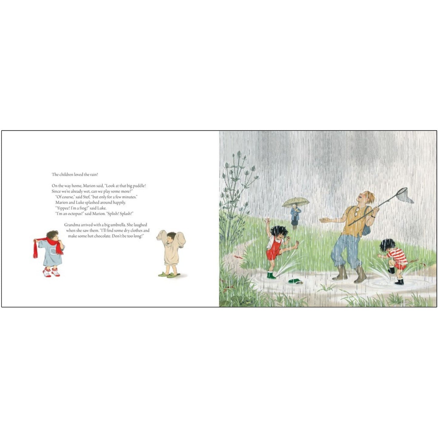 Stef takes the twins out for a walk to the pond. On their way they pass through fields full of flowers, grasshoppers and bees. They stop at a farm, where they feed the hens, pigs and ponies. But when they reach the pond, the clouds turn grey and it starts to rain. The twins love splashing about in the rain. But where do all the animals go when it rains?