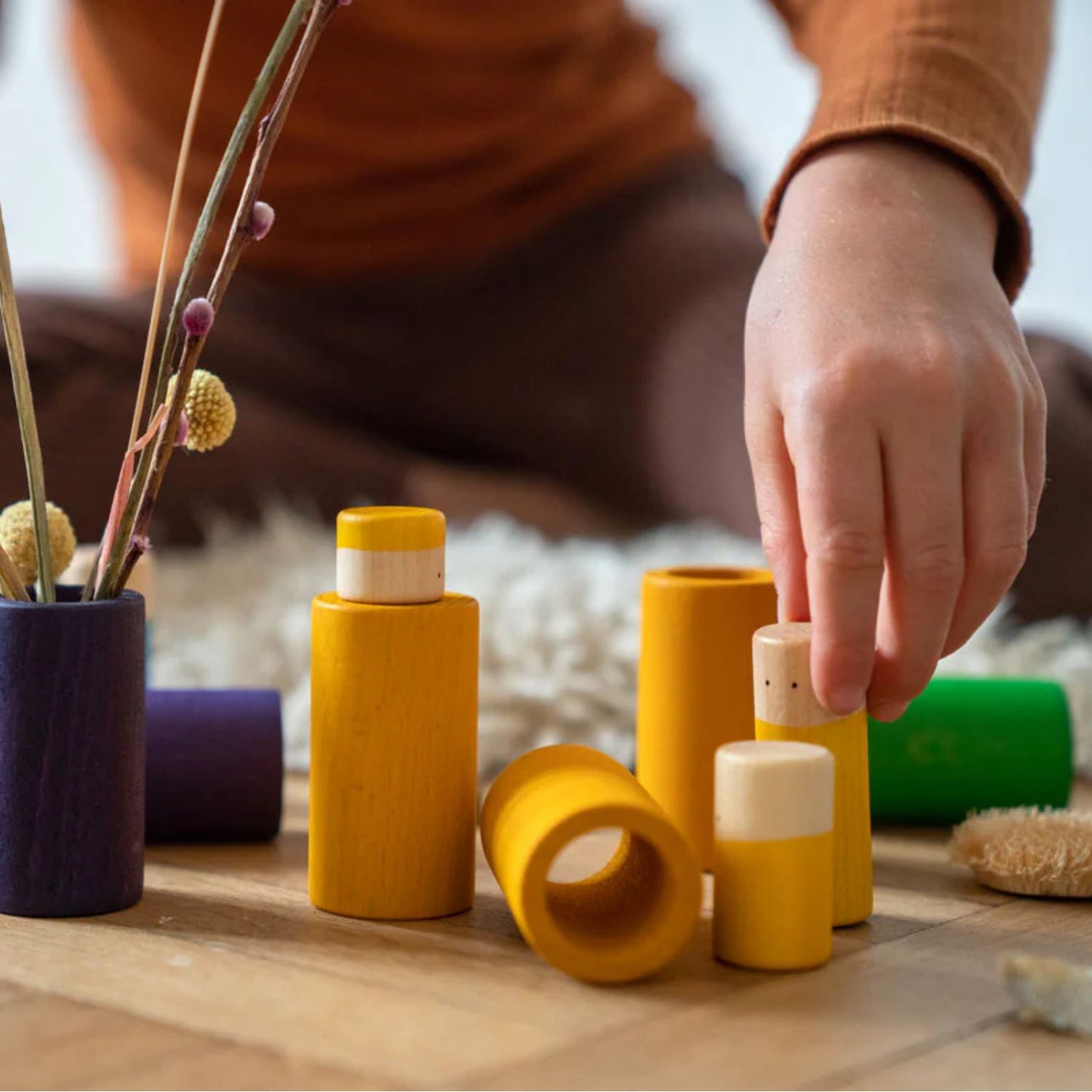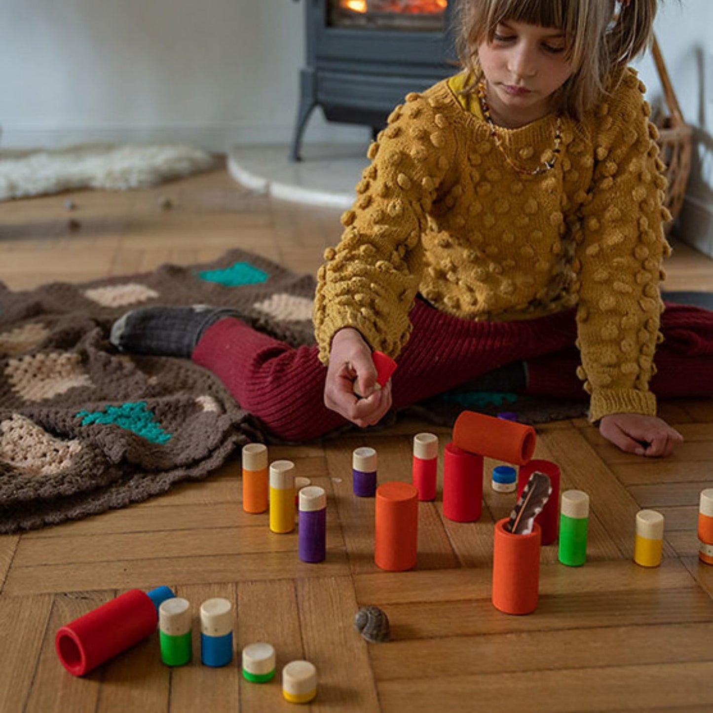 The Grapat LO 36 Piece Wooden Toy Set in classic vibrant rainbow colours is a treasure trove for open-ended play. A delightful remix of the popular large Lola set, it features 36 wooden pieces in 6 brilliant shades, designed to inspire creativity and exploration. The set includes an assortment of cylindrical parts, charming little characters (Lolas) in various heights with tiny eyes, colourful tubes, solid cylinders, and half tubes. The Lola pieces can be slotted inside the tubes and half tubes, making it perfect for imaginative building and sorting activities.