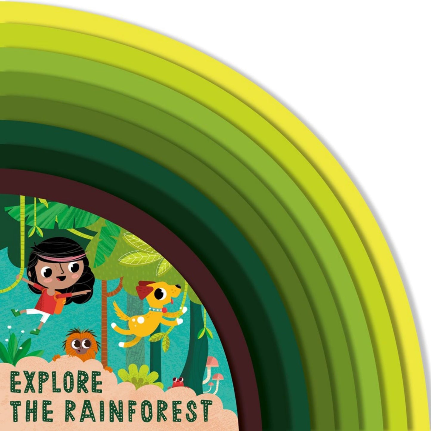 In Explore the Rainforest, Evie and her pet dog, Juno, use their senses to explore the rainforest in this bright, layered board book.