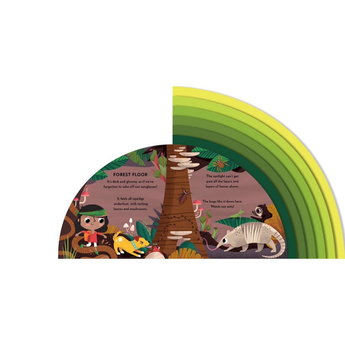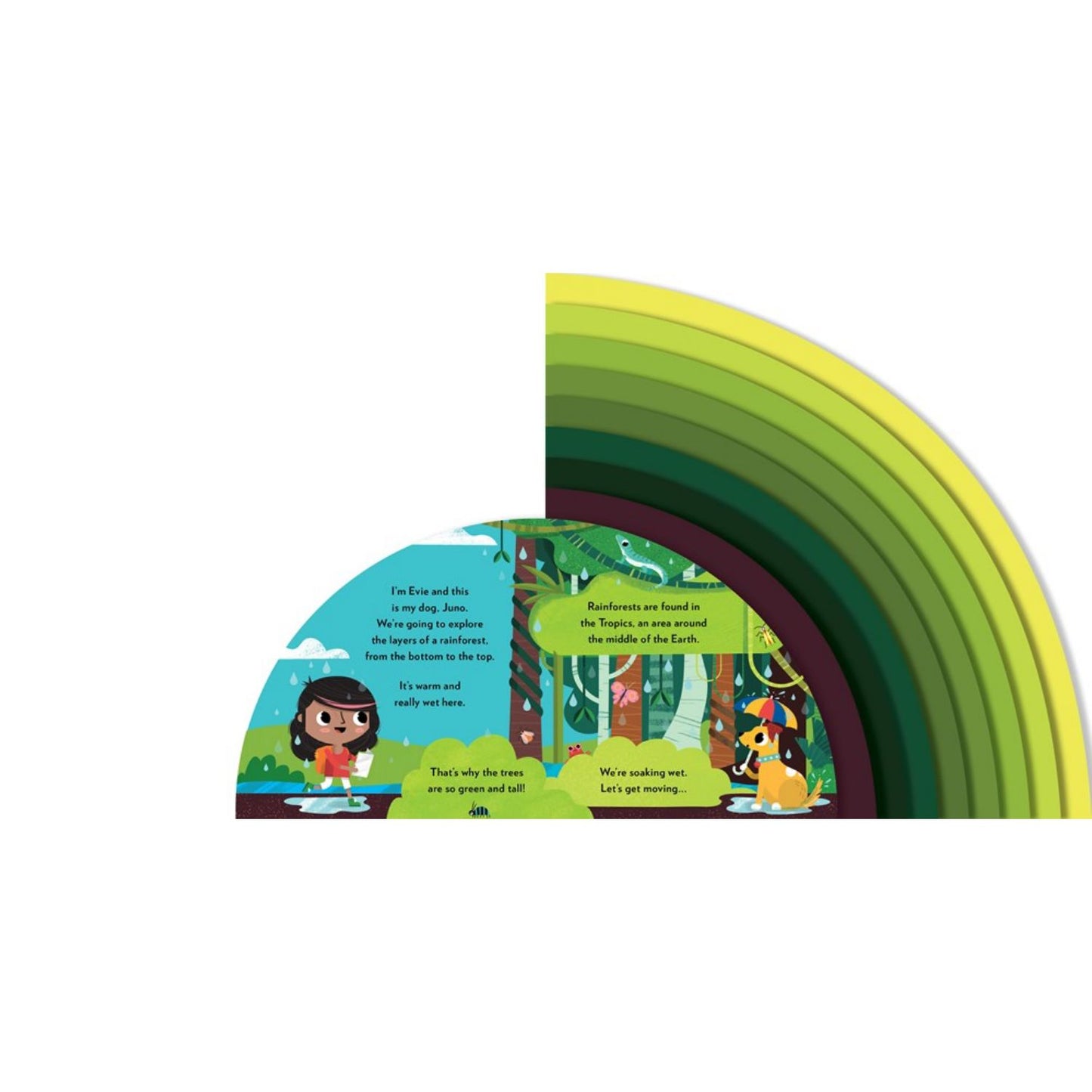 In this charming and innovative layered board book, Evie and her pet dog Juno visit all the layers of the rainforest, and tell readers what they found there. Watch them as they spot bugs playing hide and seek, chill with sloths up in the canopy and soar above the trees with friendly eagles!