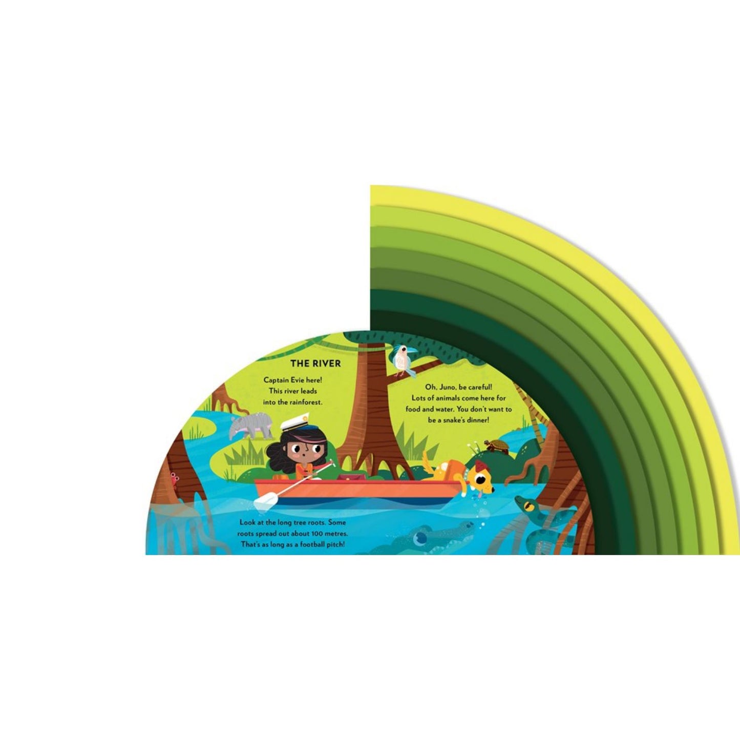 Humorous text and bold, quirky illustrations introduce each of the layers of the rainforest. Curved and layered board pages increase in size as you move through the book, developing a child's hand-eye coordination as they turn the pages.