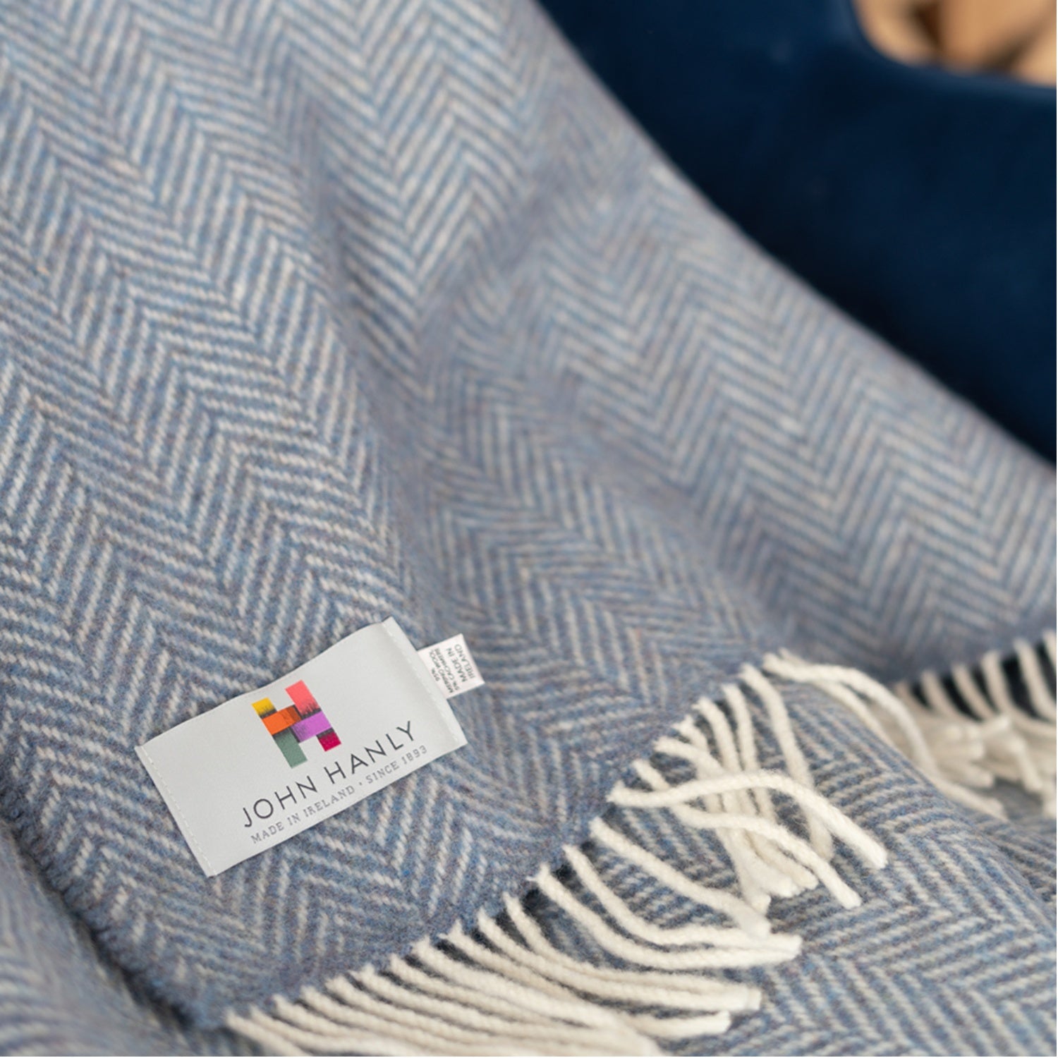 This beautiful, super-soft and cosy John Hanly cashmere throw with its gorgeous denim-cream herringbone pattern suits perfectly those who love warmth and comfort at home – this luxurious throw is just perfect for snuggling up in! John Hanly cashmere throws are made from the finest merino cashmere blend in Ballyartella, Nenagh, Co. Tipperary, they are super soft to the touch, extremely durable and will add luxury to your home – they are perfect for the end of a bed or draping on your sofa.