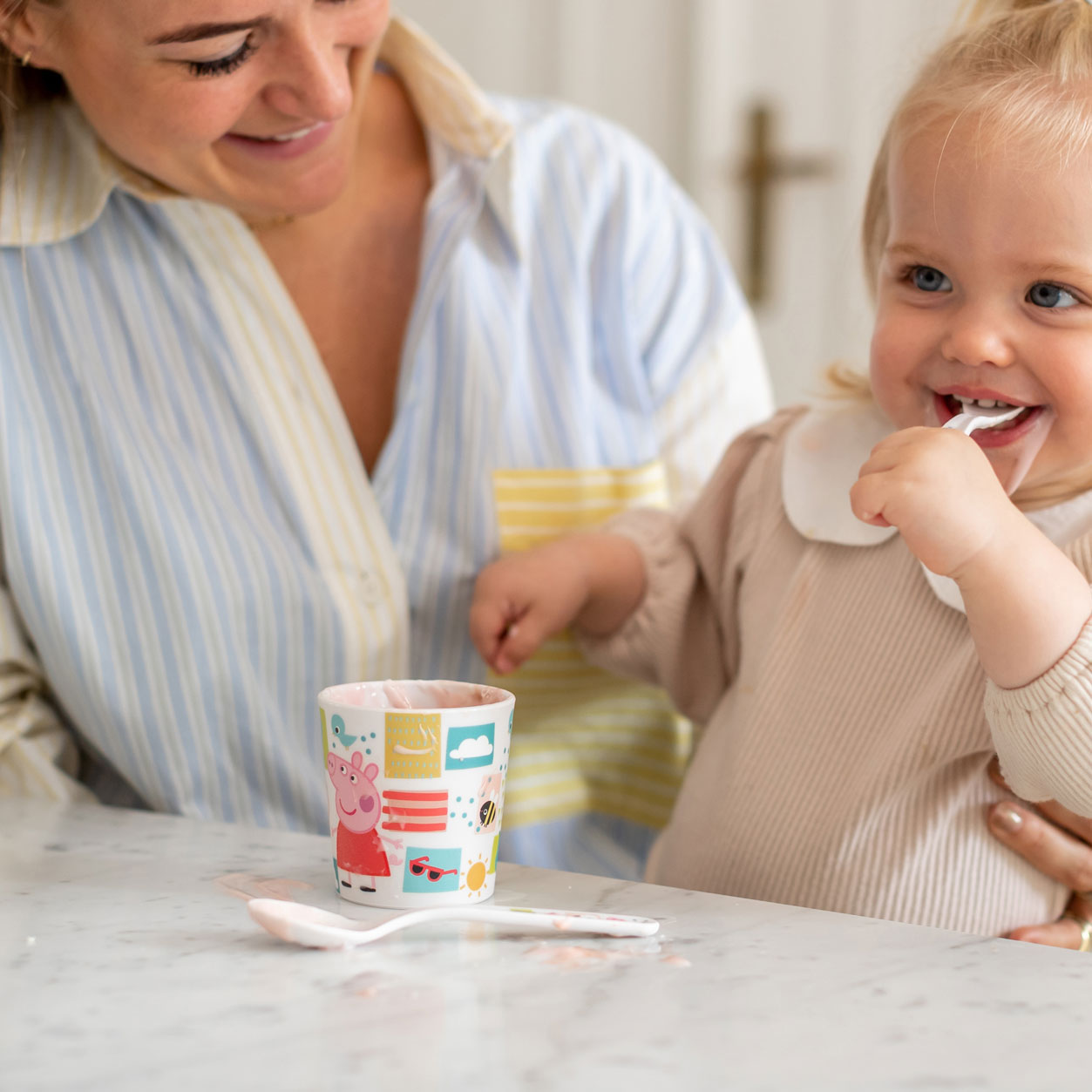 The Koziol Peppa Pig Easy Eater children’s cup and cutlery set helps to learn to eat independently. The fork and spoon have soft, rounded edges and wide handles, which are designed to be easy for little hands to hold and use. The perfectly proportioned cup is easy for little hands to hold. The cup is sturdy, light-weight, stackable and will become an indispensable companion when traveling.