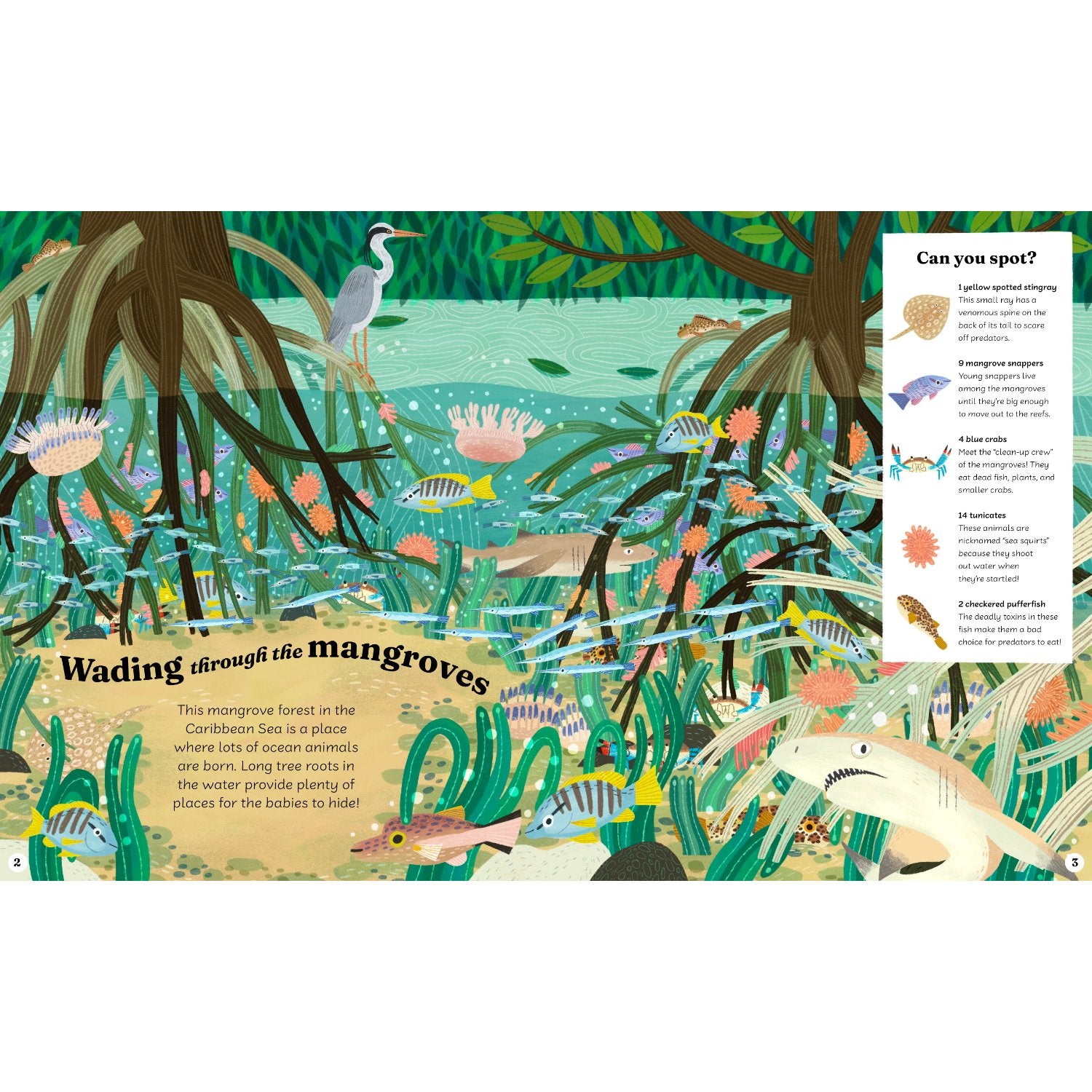 There are millions of creatures hiding in the depths of our oceans! In this beautiful search-and-find book, kids will snorkel around a coral reef, swim along a mangrove, and explore a shipwreck as they have fun for hours searching for sea creatures.