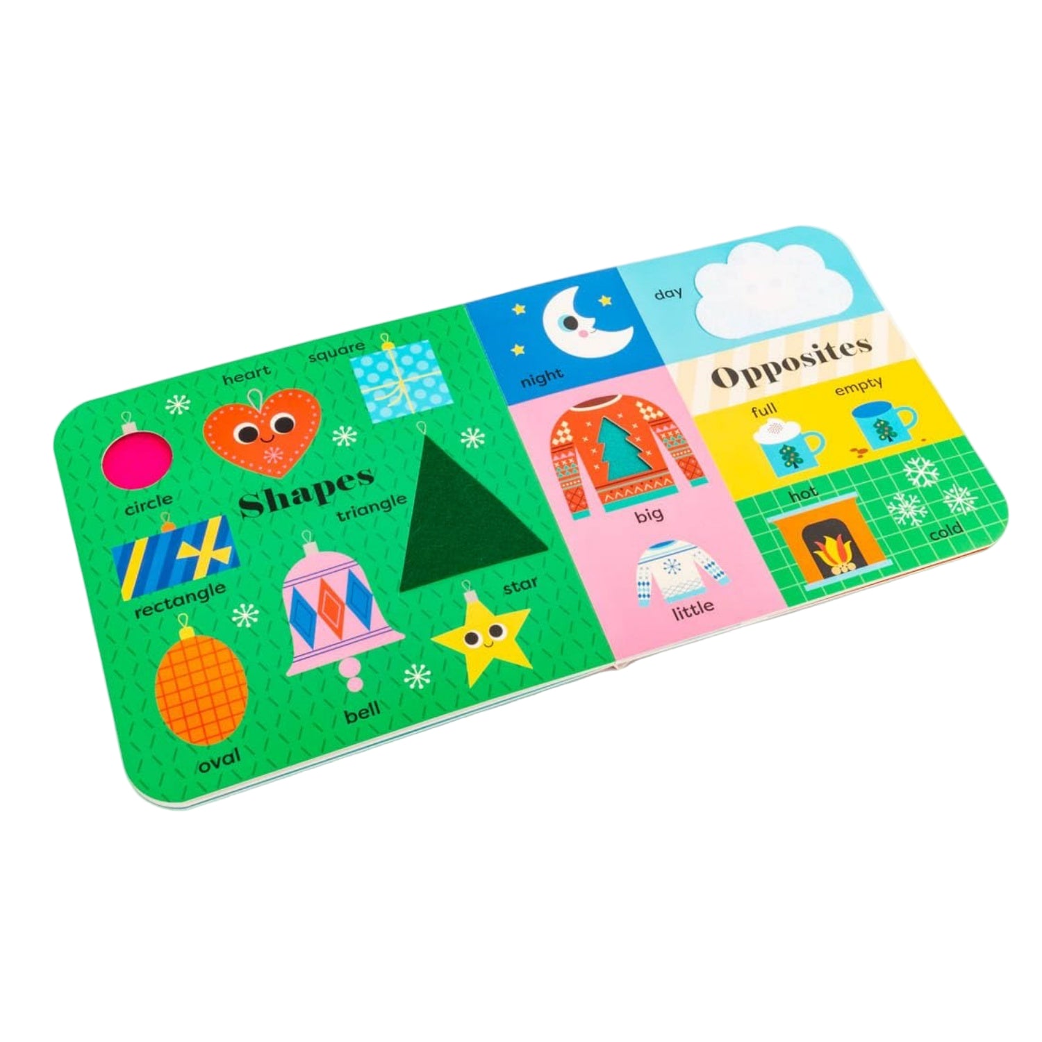 A BIG Christmas book for sharing with a little person, introducing festive first words, Christmassy colours, snowy shapes and more early-learning concepts - with additional felt flaps and a mirror!