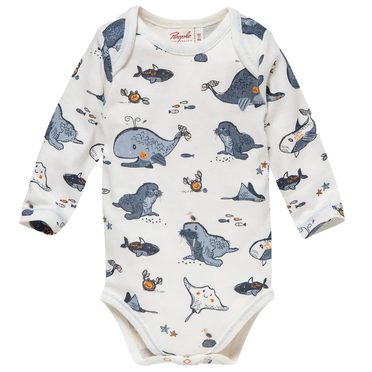 This People WEAR ORGANIC Sealife Long Sleeve Body is a super soft organic cotton bodysuit for babies and toddlers with an envelope neck for easy undressing, a cute sealife design and nickel-free, stainless-steel poppers between the legs for nappy changing time. Cut to fit cloth nappies as well.