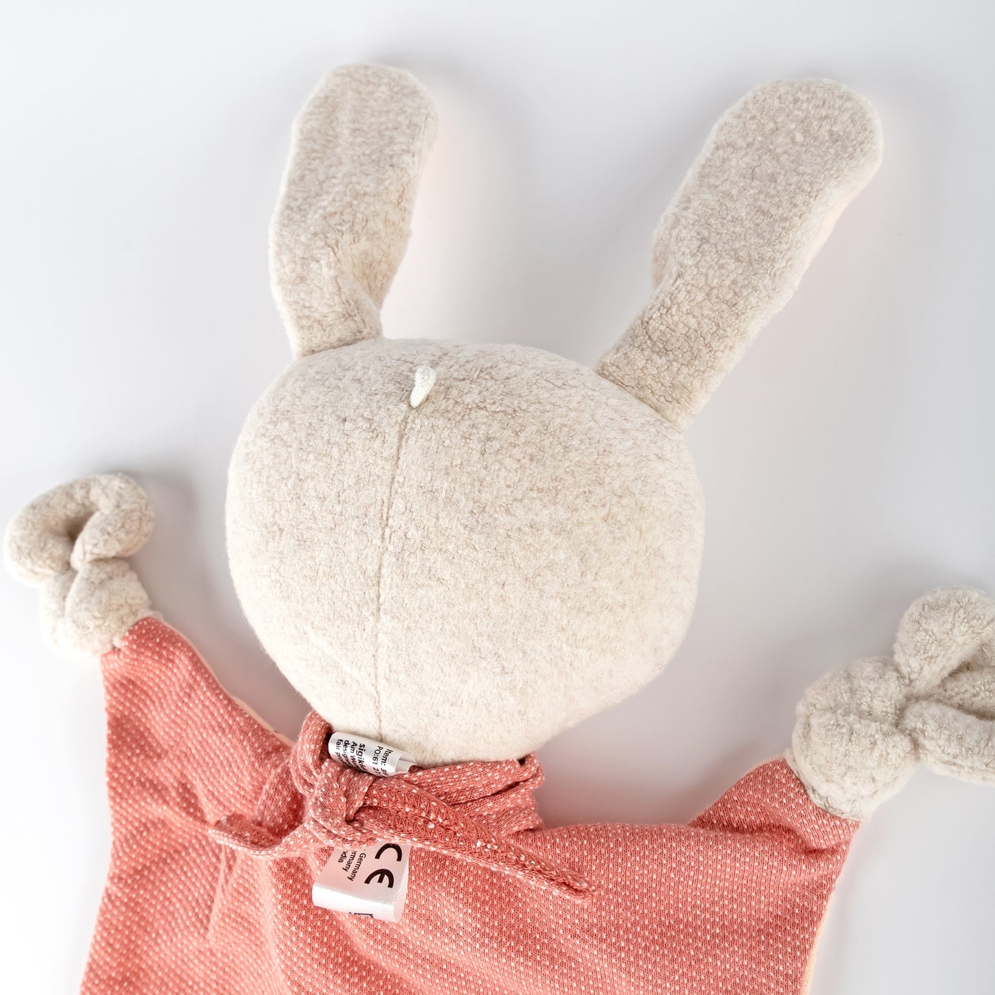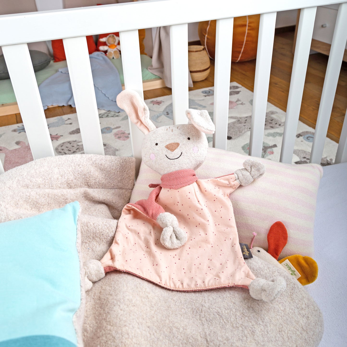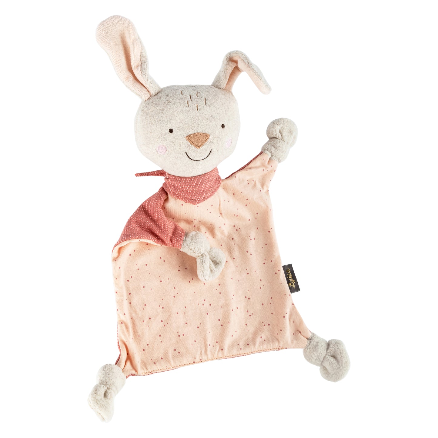 The Sigikid Rabbit Baby Comforter, in soft Nordic hues of rose pink, beige, and white, is a hygge companion for your baby's early months and beyond. Crafted from a delightful mix of terry fleece, jacquard, and jersey, it offers varied textures that are gentle to touch, cuddle, and even suck on. The embroidered facial features showcase meticulous attention to detail, and a convenient hanging loop on the back adds practicality. Comforters provide babies with a sense of security during lonely moments, often becoming indispensable companions, making it essential to choose one thoughtfully. Suitable from birth, this comforter features four knotted corners for grasping. The front body is made of soft jersey, the back of jacquard, and the head and corners of terry fleece, with plush stuffing in the head. It's machine-washable on a 30°C delicate cycle.